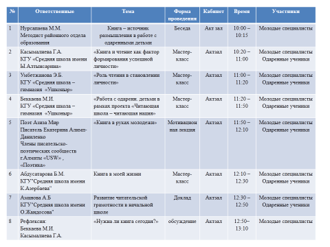 Умбетжанова Э.Б. КГУ «Средняя школа – гимназия «Ушконыр» ,«Роль чтения в становлении личности» Абдусатарова Б.М. ,КГУ"Средняя школа имени К.Азербаева, «Книга в моей жизни» ,Аманова А.Б КГУ "Средняя школа имени О.Жандосова,"Развитие читательской грамотности в начальной школе».