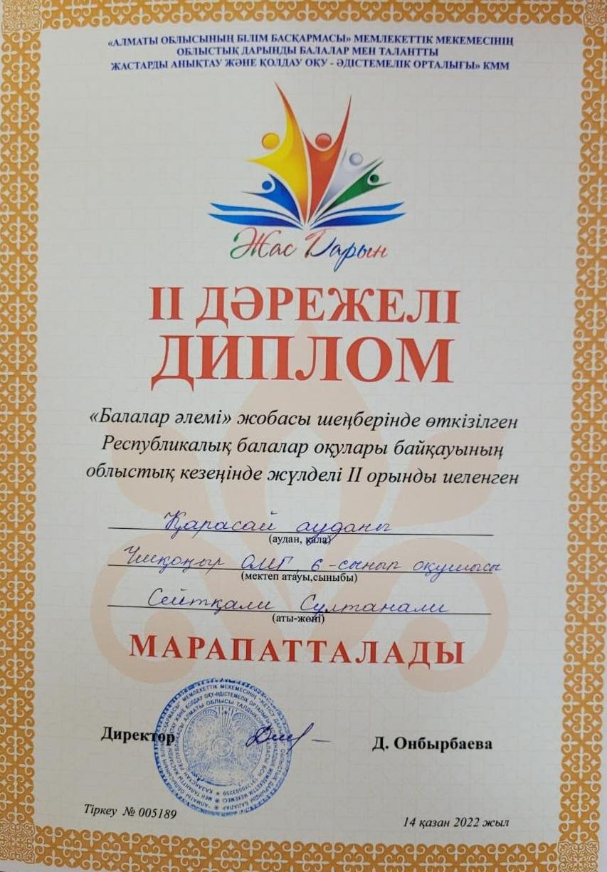 • Республикалық олимпиаданың облыстық кезеңі, ағылшын тілі пәні бойынша 3 орын, Бакишева Нария