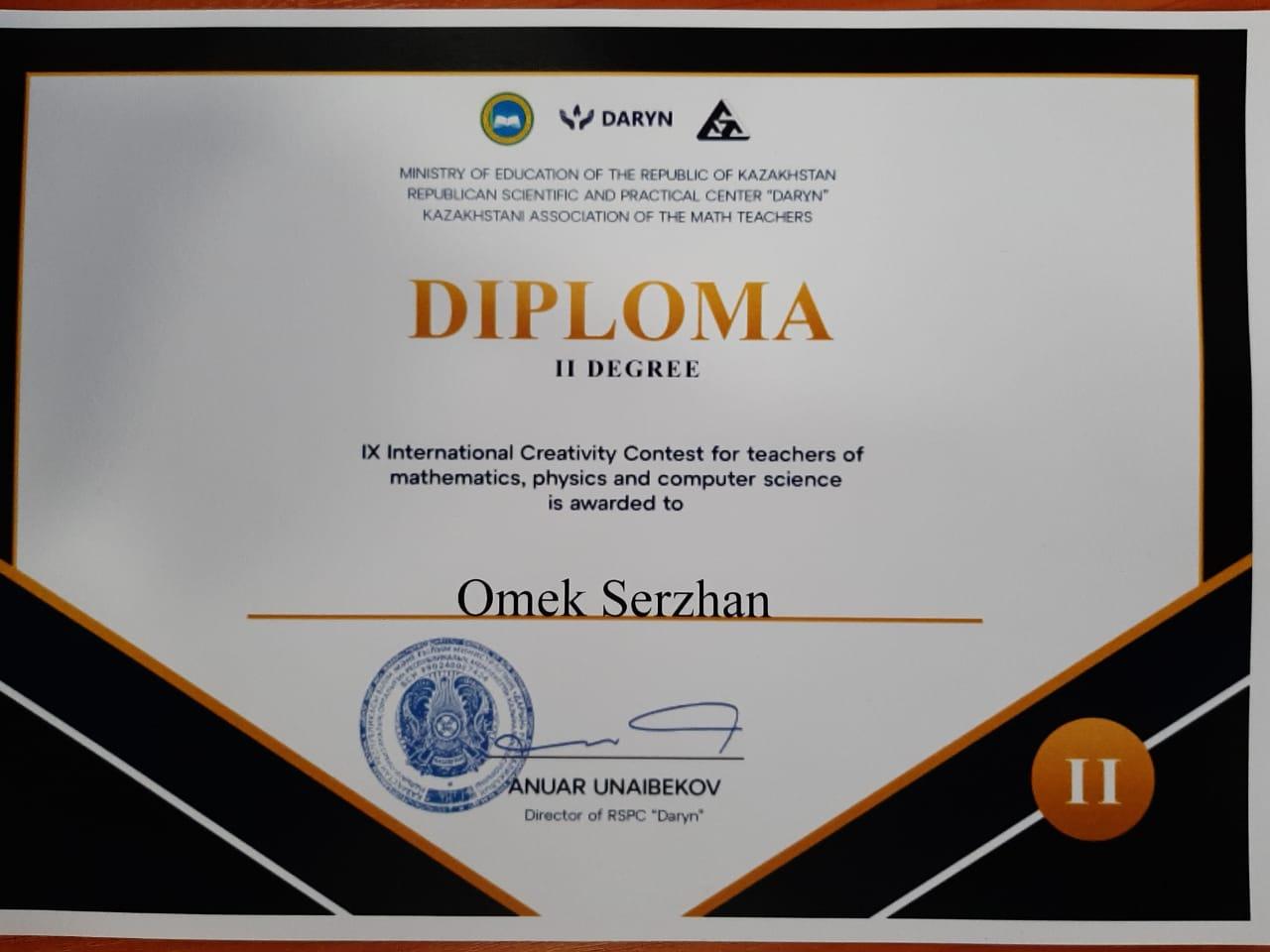 05 декабрь 2022 0 1 2 3 4 5 ІХ халықаралық байқау Мұғалімдер арасында математика, физика, информатика пәндерінен өткізілген IX халқаралық шығармашылық байқауында математика пәнінің мұғалімі Өмек Сержан 2-дәрежелі дипломмен марапатталды.