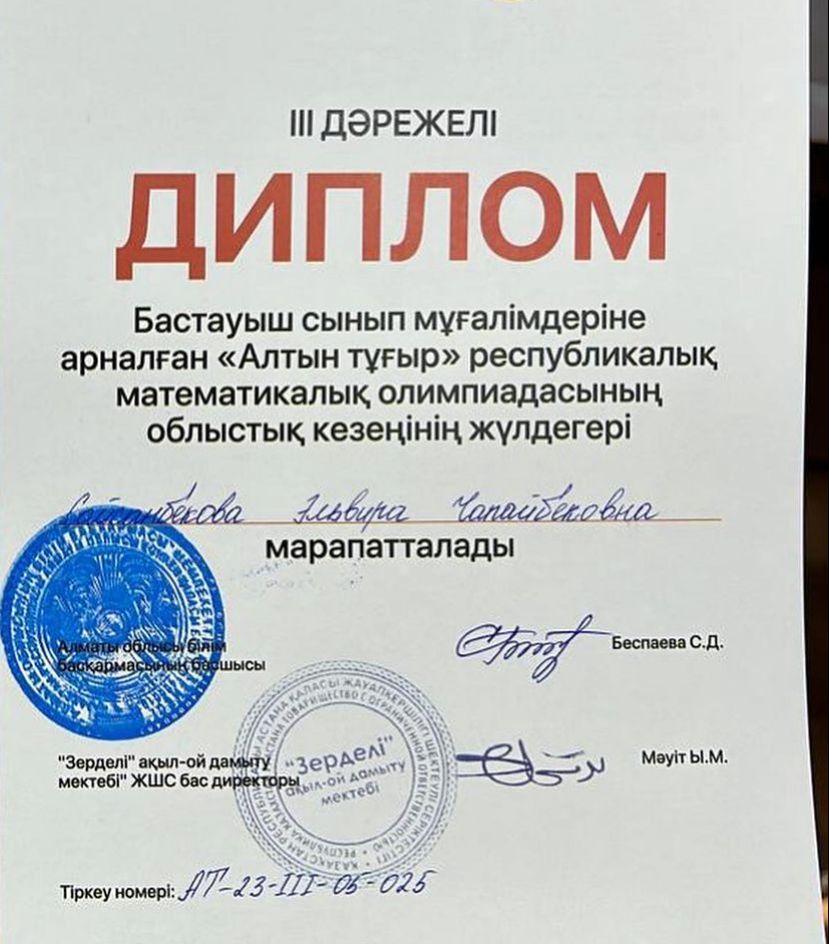05 январь 2024 0 1 2 3 4 5 “Алтын тұғыр” республикалық математикалық олимпиадасы Бастауыш сынып мұғалімдеріне арналған “Алтын тұғыр” республикалық математикалық олимпиадасының облыстық кезеңінің ІІІ дәрежелі диплом жүлдегері Сайсанбекова Эльвира Чапайбековнаны құттықтаймыз👏👏👏