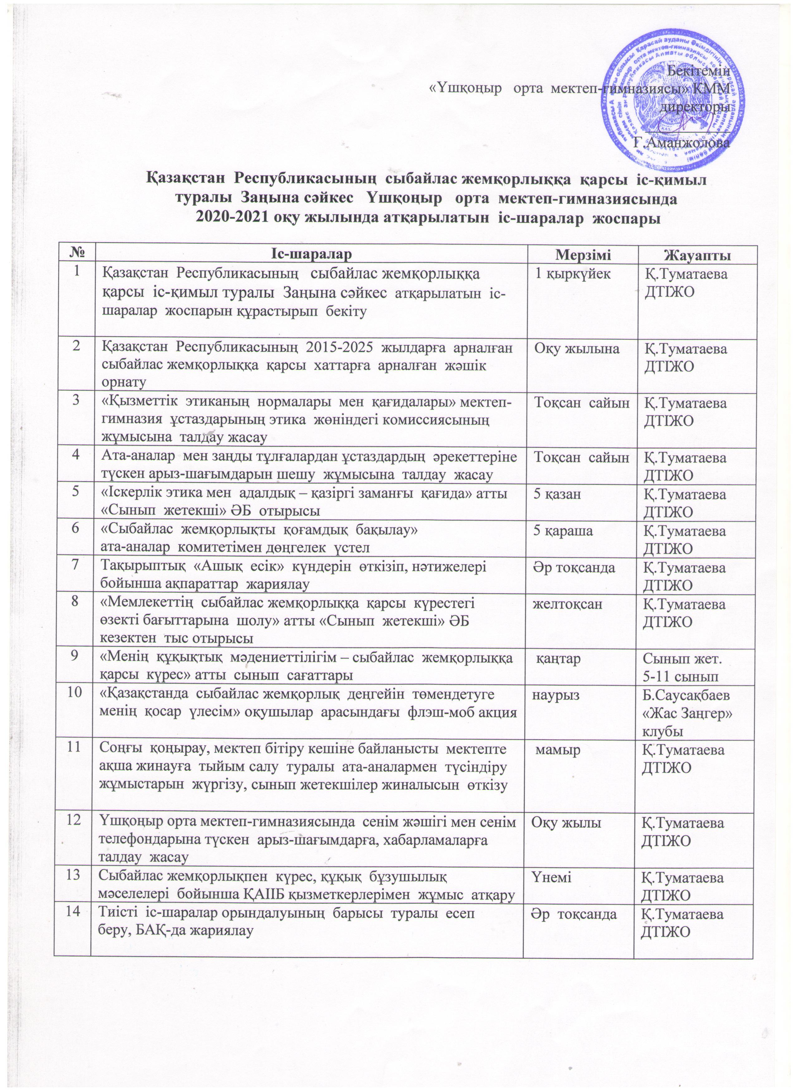 Үшқоңыр орта мектеп-гимназиясындағы сыбайлас жемқорлыққа қарсы іс-қимыл туралы Заңының іске асырылуына бағытталған жұмыс жоспары