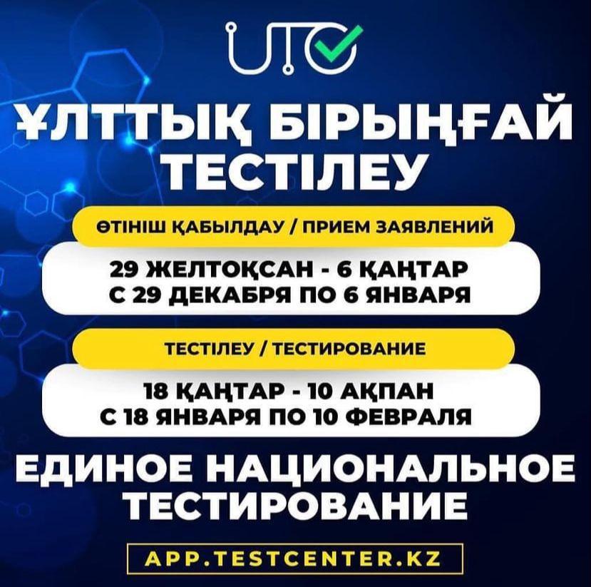 💻Қаңтар айындағы ҰБТ-ға өтініштерді қабылдау 29 желтоқсанда басталып, 6 қаңтарға дейін жалғасады.
