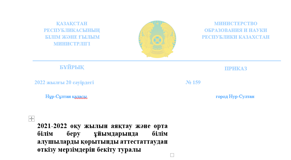 «Білім туралы» Қазақстан Республикасы Заңының 5-бабының 14) тармақшасына сәйкес, сондай-ақ меншік нысанына және ведомстволық бағыныстылығына қарамастан орта білім беру ұйымдарында 2021-2022 оқу жылын ұйымдасқан түрде аяқтау мақсатында БҰЙЫРАМЫН:
