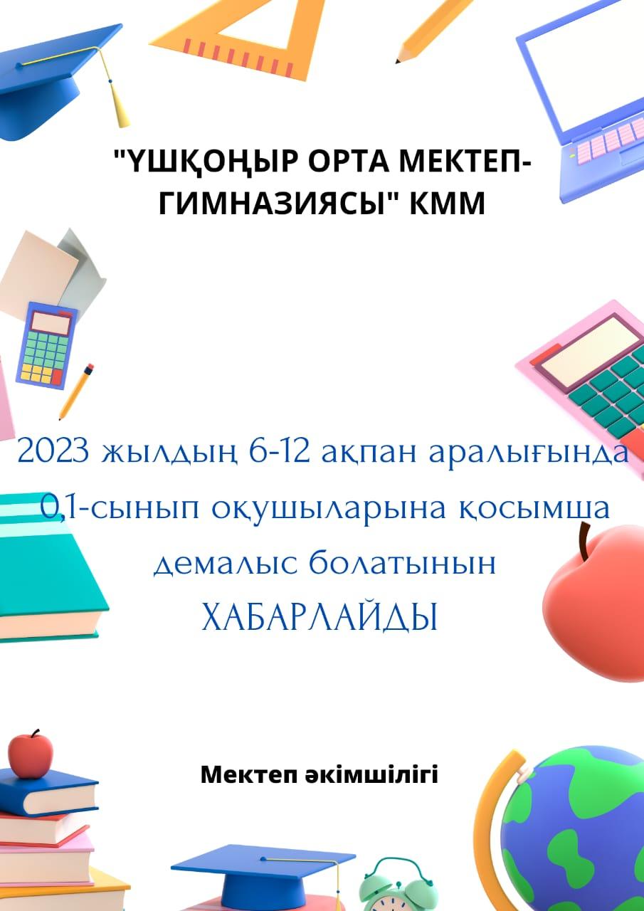 03 февраль 2023 0 1 2 3 4 5 Қосымша демалыс 0, 1 сынып оқушылары үшін 6-12 ақпан аралығында қосымша демалыс жарияланды